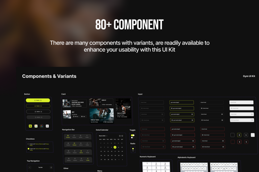 Gym App UI Kit crafted with precision and innovation. Whether you're a seasoned designer or a fitness enthusiast with a knack for UI, Gymnation is your go-to solution for creating stunning and user-friendly gym applications.